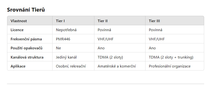 - Síťová infrastruktura: Tier I (peer-to-peer), Tier II (repeater), Tier III (trunking).